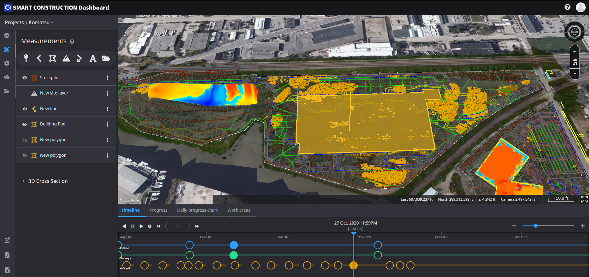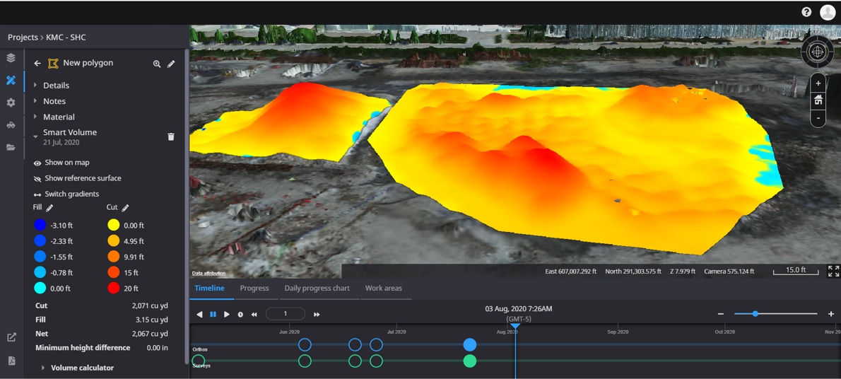 Receive daily progress updates from machine as-built data with your Komatsu Intelligent Machine Control machines. Measure progress between drone flights and as-built data. Fly less often with progress reporting directly from your machines.