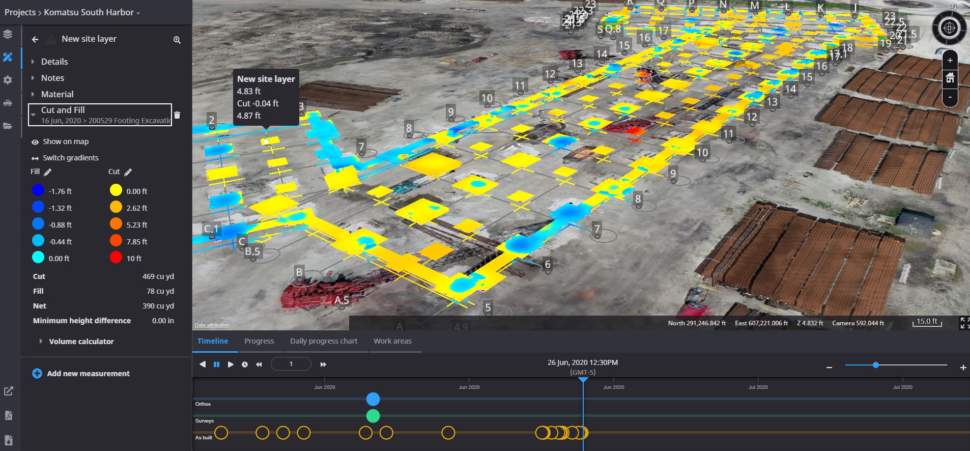 Watch your site progress with timeline functions, including playback, in terms of whole-site visuals, cross-sections and individual measurements.