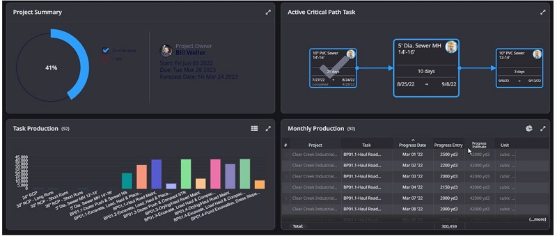Visual progress metrics around workforce, equipment and material cost. Easy to read and understand dashboards provide critical insights into your project health across all of your job sites.